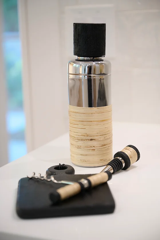 The Desert Rattan Cocktail Shaker is ethically crafted with black wood and hand-wrapped rattan. Pair it with the complete barware collection for a uniformed look that impresses your guests.